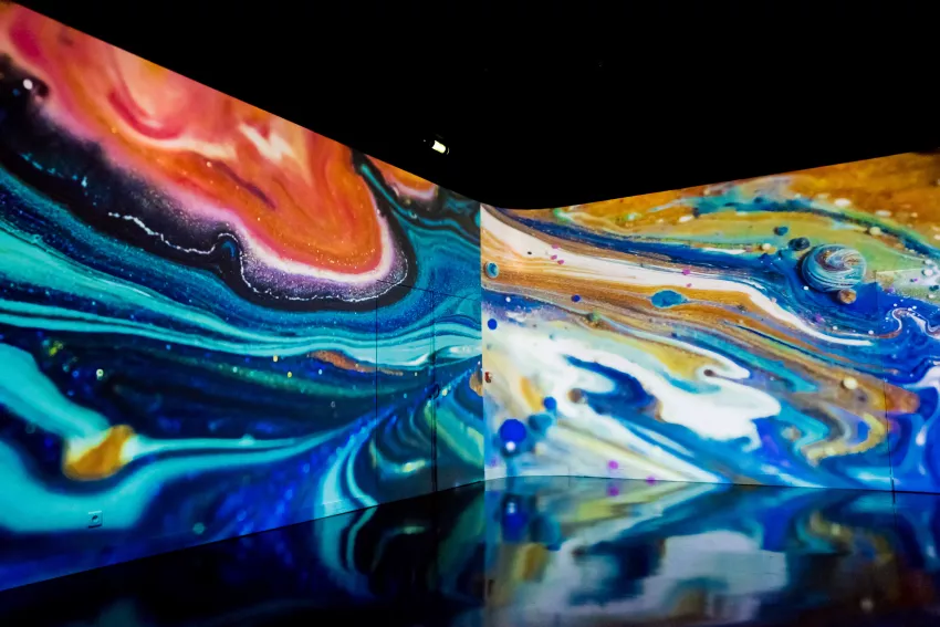The immersive video Colours X Colours is the fruit of a two-year collaboration between the artists Thomas Blanchard and Oilhack. For 24 minutes, the two artists from Lyon will offer visitors an opportunity to immerse themselves in the most incredible macro videos of paintings and discover the various natural reactions of the materials. The images, projected onto all the walls in LE STUDIO, capture the movements that occur within artistic creations, painted in acrylic paint, oil paint, or soap, and provide an opportunity, thanks to a high optical magnification, to view painting and its techniques from a new perspective.